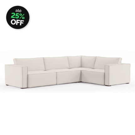 2 Assentos com término em chaise sem braço + 1 Assento fixo sem braço + 1 Assento sem braço canto/ Encosto fixo/ Almofadas soltas/ Opção de personalização de medidas, tecido, conforto e automação.