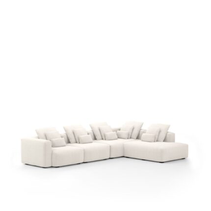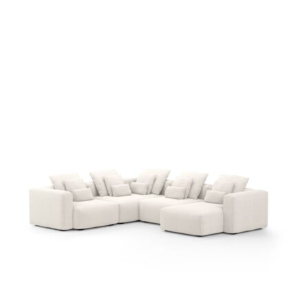 1 Assento retrátil com braço lateral direito + 1 Assento com término em Chaise/ Encosto fixo/ Almofadas soltas/ Opção de personalização de medidas, tecido, conforto e automação.
