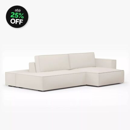 1 Assento fixo com braço lateral esquerdo + 1 Assento com término em chaise + 2 Puff traseiros/ Encosto fixo/ Almofadas soltas/ Opção de personalização de medidas, tecido, conforto e automação.