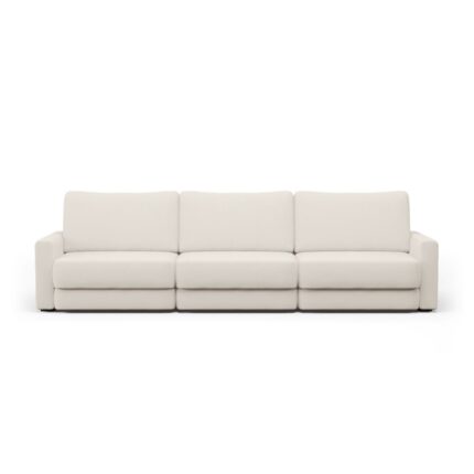 3 Assentos retráteis/ Encosto reclinável/ Almofadas fixas/ Opção de personalização de medidas, tecido, conforto e automação.