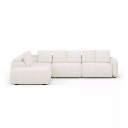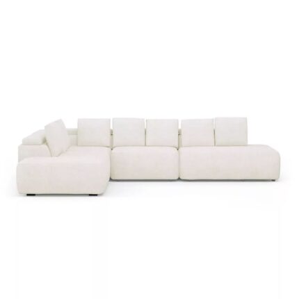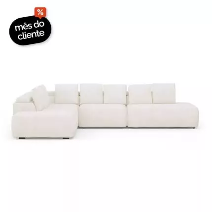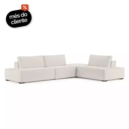 2 Assentos com término em chaise sem braço + 1 Assento fixo sem braço + 1 Assento sem braço canto/ Encosto fixo/ Almofadas soltas/ Opção de personalização de medidas, tecido, conforto e automação.