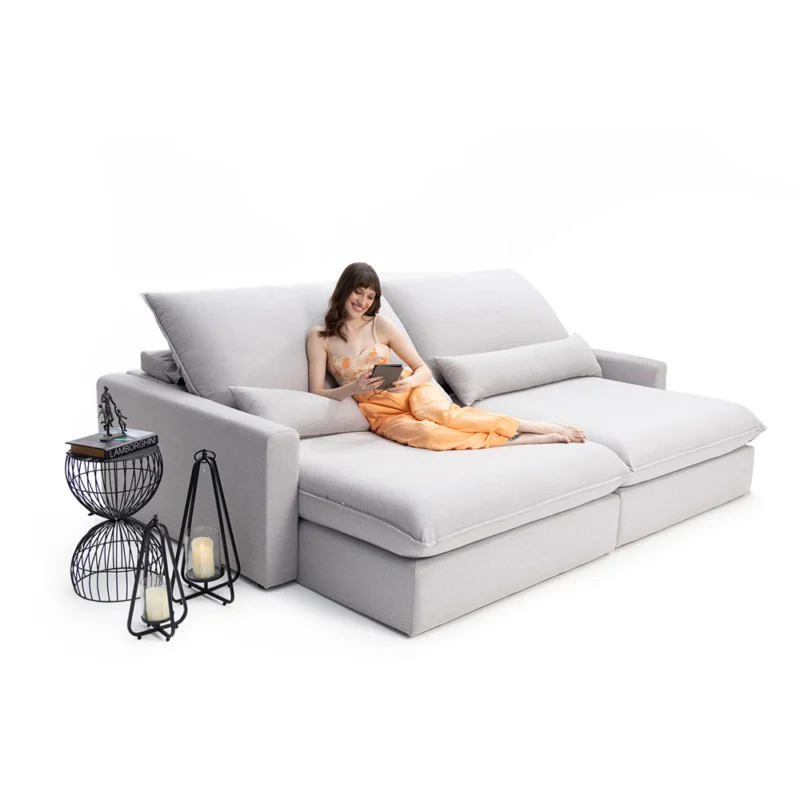2 Assentos retráteis/ Encosto fixo/ Almofadas soltas/ Opção de personalização de medidas, tecido, conforto e automação.