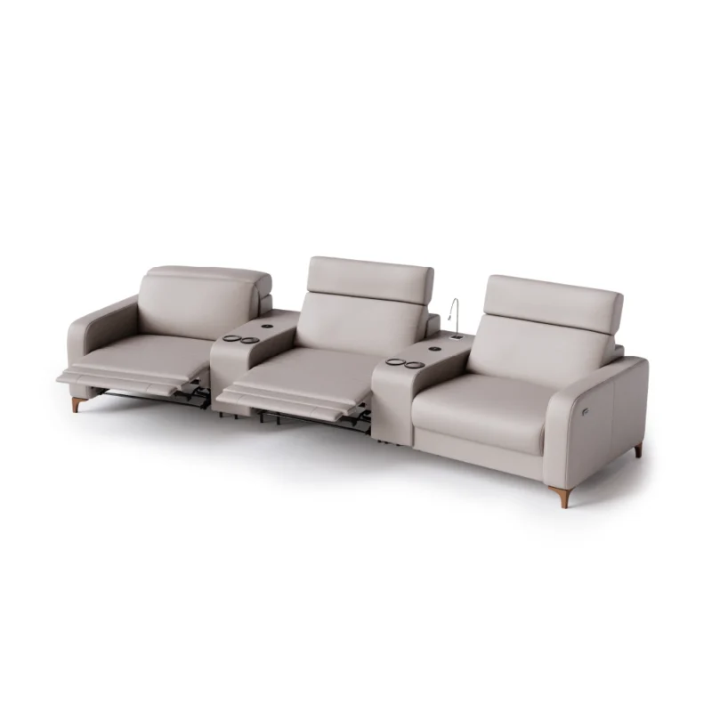 3 Assentos retráteis/ Encosto reclinável/ Almofadas fixas/ Opção de personalização de medidas, tecido, conforto e automação.