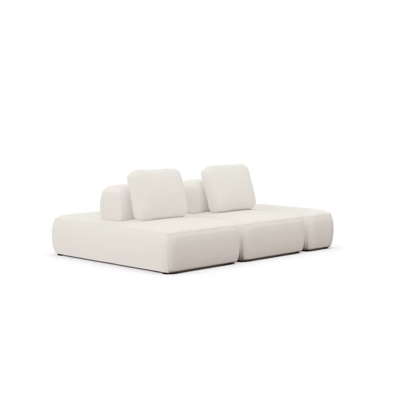 2 Assentos com término em chaise + 1 Assento fixo central/ Encosto fixo/ Almofadas soltas/ Opção de personalização de medidas, tecido, conforto e automação.