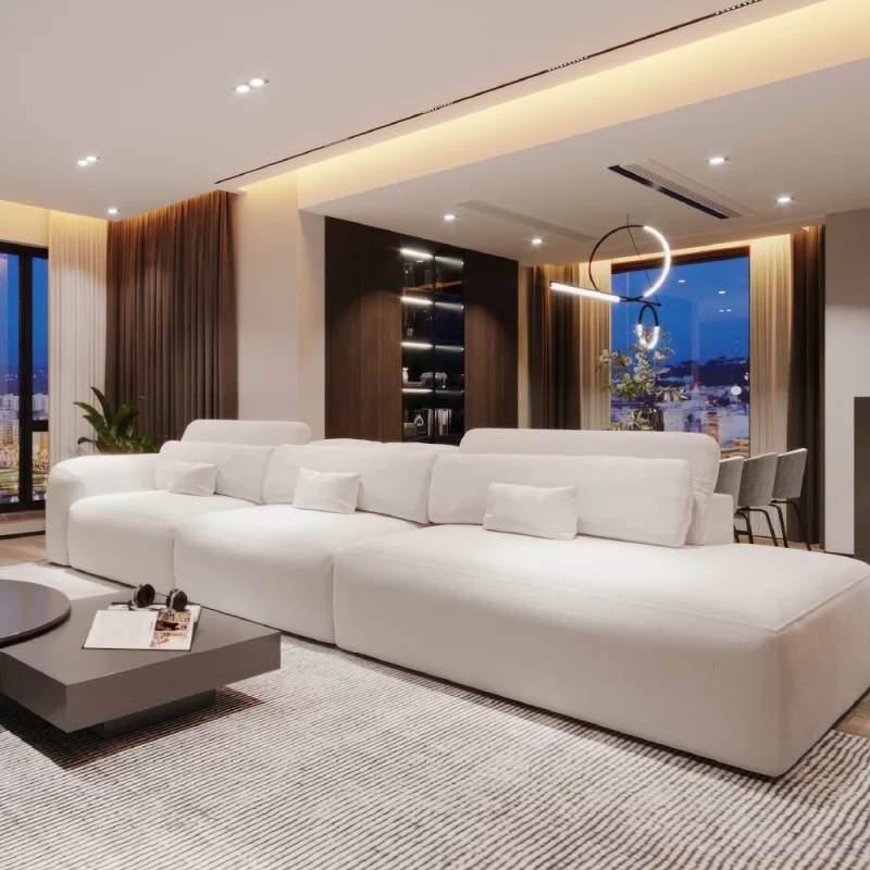 1 Assento fixo com braço lateral direito + 1 Assento fixo sem braço + 1 Assento com término em chaise/ Encosto fixo/ Almofadas soltas/ Opção de personalização de medidas, tecido, conforto e automação.