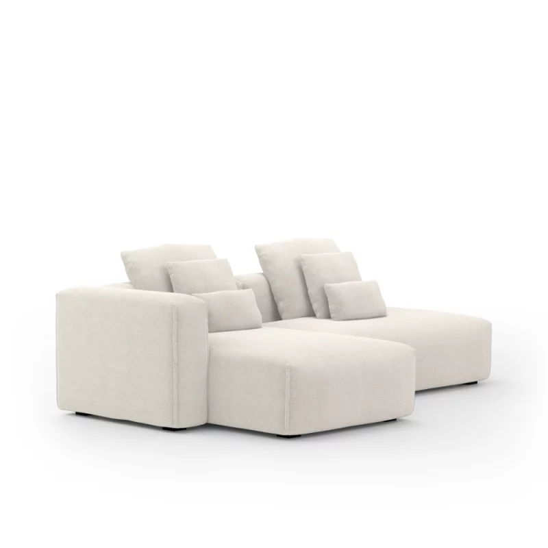 1 Assento fixo com braço lateral esquerdo + 1 Assento sem braço canto + 1 Assento com término em Chaise/ Encosto fixo/ Almofadas soltas/ Opção de personalização de medidas, tecido, conforto e automação.