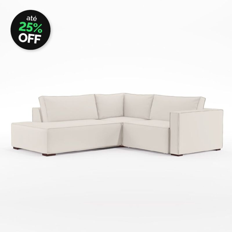 1 Assento fixo com braço lateral esquerdo + 1 Assento sem braço canto + 1 Assento com término em Chaise/ Encosto fixo/ Almofadas soltas/ Opção de personalização de medidas, tecido, conforto e automação.