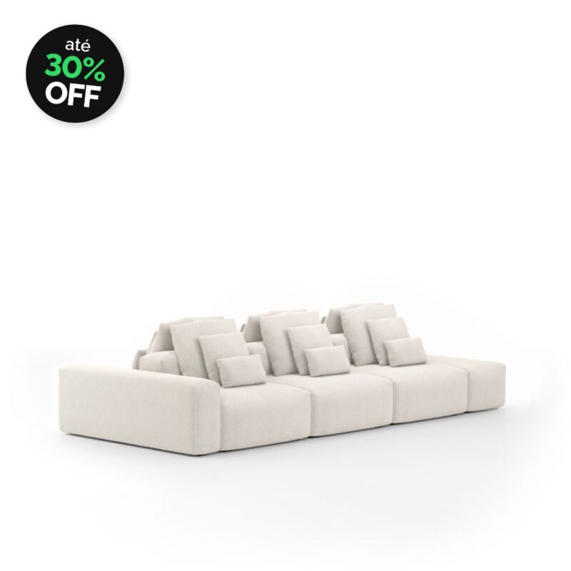 2 Assentos fixos com braço + 1 Assento sem braço canto/ Encosto fixo/ Almofadas soltas/ Opção de personalização de medidas, tecido, conforto e automação.