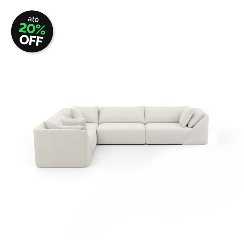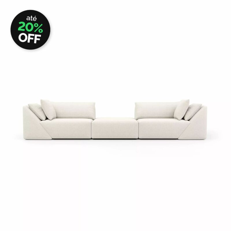 2 Assentos fixos com braço + 1 Assento sem braço central + 1 Assento sem braço canto/ Encosto fixo/ Almofadas soltas/ Opção de personalização de medidas, tecido, conforto e automação.