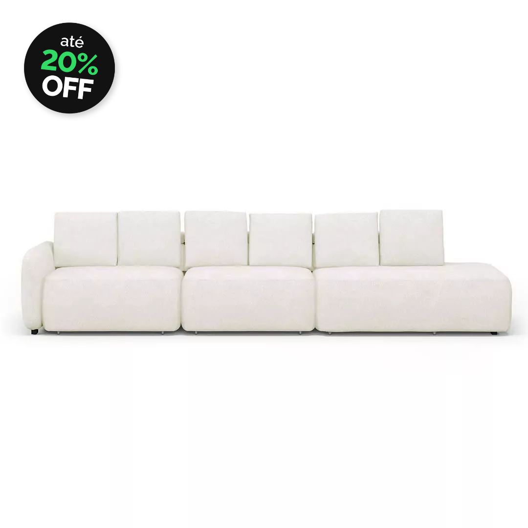 1 Assento retrátil com braço lateral esquerdo + 1 Assento com término em chaise + 2 Puff traseiros/ Encosto fixo/ Almofadas soltas/ Opção de personalização de medidas, tecido, conforto e automação.